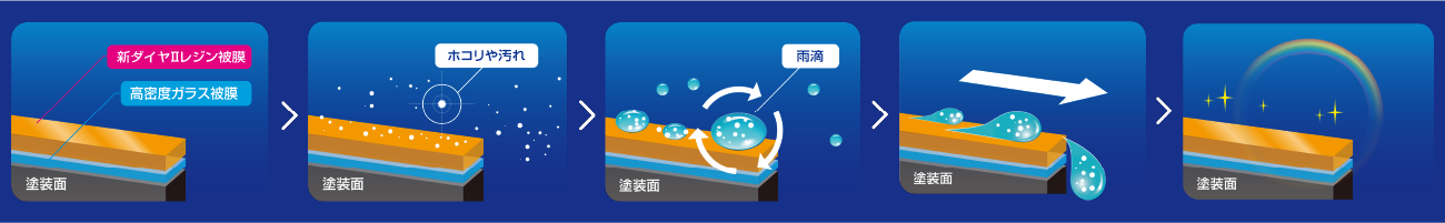 ダイヤIIキーパーは、特殊な表面の分子構造により、ホコリや汚れが降り積もっても、自然の雨が降ると雨滴の中に分散し、雨滴と一緒に汚れが流れ落ちて、ピッカピカになります!