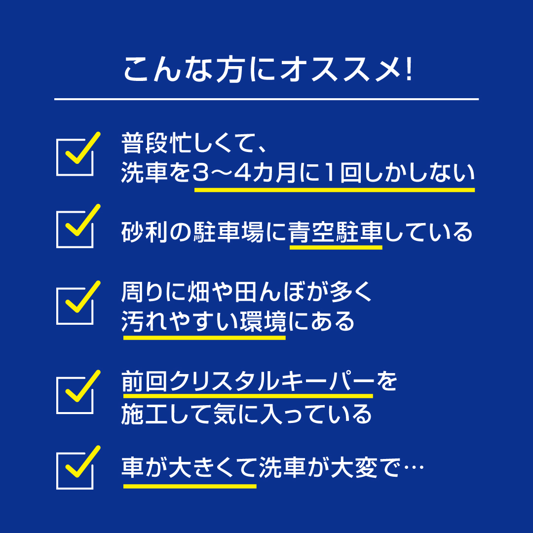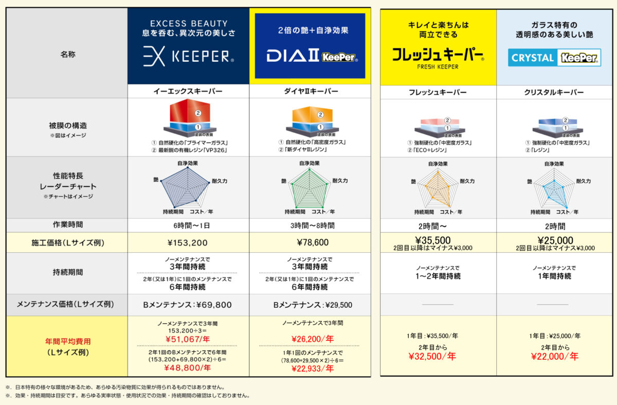 A. ツヤをしっかり出したい方、汚れにくさを重視したい方、お手入れをラクにしたい方など、ご希望に合わせておすすめのメニューをご案内します。迷った場合はお気軽にご相談ください。
